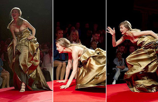??诰W(wǎng)5月20日消息? 戛納電影節(jié)上,“恨天高”又惹禍了!在Fashion For Relief慈善時裝秀上,超模Lindsey Wixson不慎被金色長裙絆倒,連摔三次。但她仍然很具職業(yè)精神,優(yōu)雅起身并微笑著縱身起舞,贏得了對面男模以及在場觀眾的鼓勵。