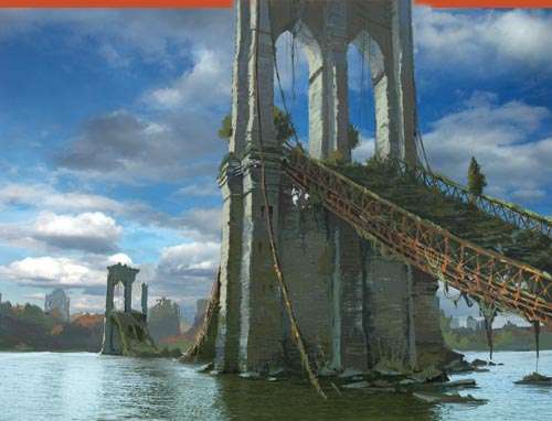 曼哈頓水流縱橫,泥淖遍地。毀損的街道已然浸沒于水中。一百年后大多數(shù)房屋的屋頂都已塌落,這加速了這些建筑的結(jié)構(gòu)性損壞。三百年后紐約市的吊橋已經(jīng)倒塌,那些鐵路拱橋或可維持數(shù)百年之久。