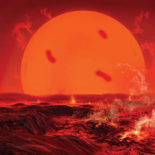 奄奄一息的太陽開始膨脹并吞噬了太陽系所有內(nèi)行星(inner planets,即水星和金星),地球也隨之蒸發(fā)殆盡。
