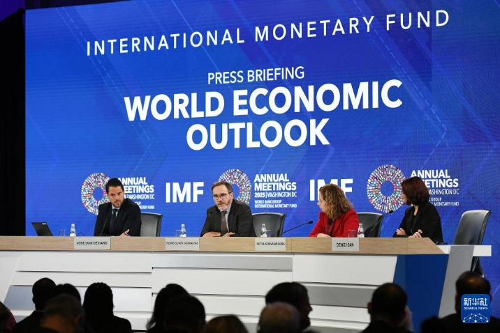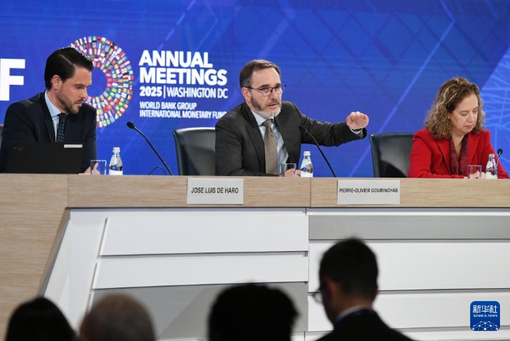 10月14日,在美國華盛頓,國際貨幣基金組織首席經(jīng)濟(jì)學(xué)家皮埃爾-奧利維耶·古蘭沙(左二)在《世界經(jīng)濟(jì)展望報告》新聞發(fā)布會上講話。新華社記者 李睿 攝
