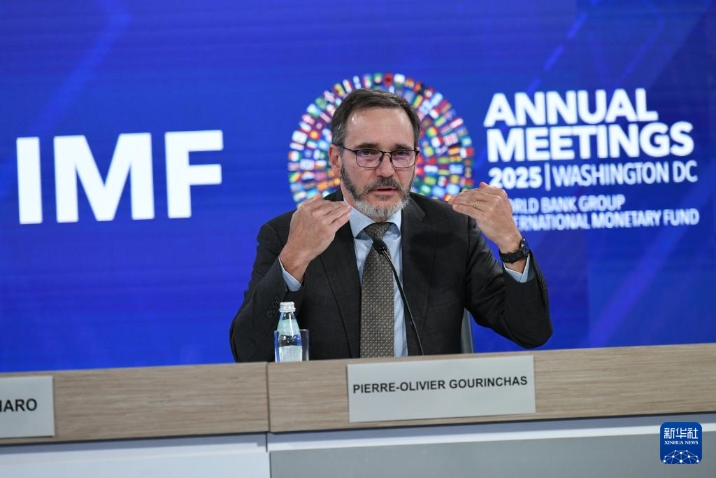 10月14日,在美國華盛頓,國際貨幣基金組織首席經(jīng)濟(jì)學(xué)家皮埃爾-奧利維耶·古蘭沙(中)在《世界經(jīng)濟(jì)展望報告》新聞發(fā)布會上講話。新華社記者 李睿 攝