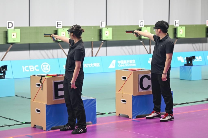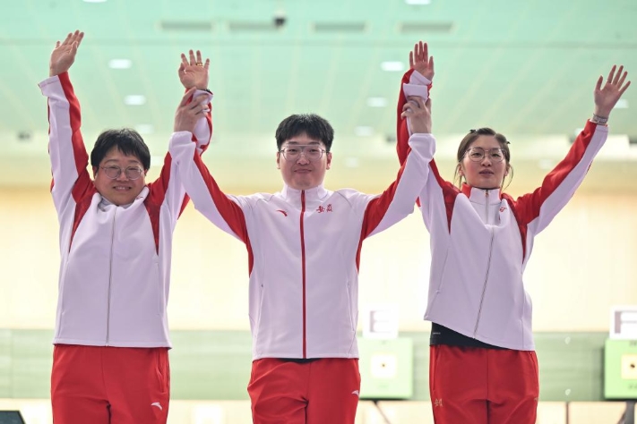 另一場(chǎng)決賽中,50米步槍三姿混合團(tuán)體項(xiàng)目冠軍在浙江隊(duì)的兩對(duì)組合之間展開。趙中豪/王子菲在“搶31”賽制中以34:26擊敗隊(duì)友沈宇辰/韓佳予,為浙江隊(duì)包攬金、銀牌。天津隊(duì)趙文宇/張力元獲得銅牌。