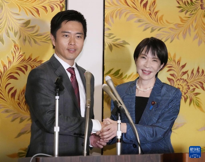 10月20日,在位于日本東京的日本國會,日本自民黨總裁高市早苗(右)與維新會黨首吉村洋文在記者會上握手。新華社/共同社
