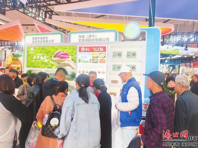 在第二十二屆農(nóng)交會現(xiàn)場,海南(潭牛)文昌雞股份有限公司展位人氣旺盛。(采訪對象供圖)