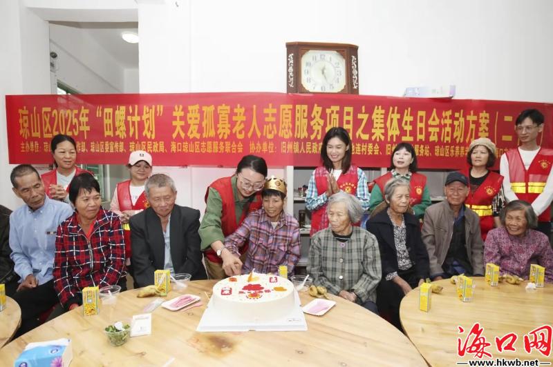 海口網(wǎng)10月26日消息(記者方真好 特約記者許晶亮)“祝您生日快樂,祝您生日快樂……”悠揚(yáng)的生日歌在舊州鎮(zhèn)池連村委會(huì)照料中心回蕩,一張張布滿皺紋的臉上洋溢著幸福的笑容。10月24日,“田螺計(jì)劃”關(guān)愛孤寡老人志愿服務(wù)項(xiàng)目之集體生日會(huì)溫馨舉行,來自舊州鎮(zhèn)池連村委會(huì)的30余名老人在志愿者的陪伴下,度過了一個(gè)熱鬧又暖心的生日,感受到了如同家人般的關(guān)愛與溫暖。