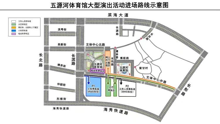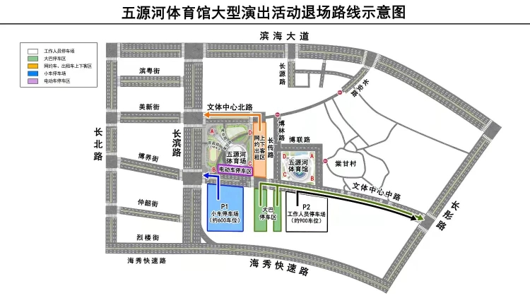 長(zhǎng)彤路→文體中心中路五源河體育館(臨時(shí)上落)→長(zhǎng)傳路網(wǎng)約車、出租車上落客區(qū)。