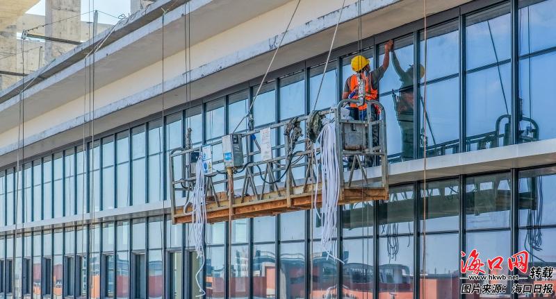 1月16日,在??诟咝聟^(qū)生物醫(yī)藥產(chǎn)業(yè)創(chuàng)新中心項(xiàng)目現(xiàn)場(chǎng),施工人員正在進(jìn)行玻璃幕墻安裝作業(yè)。記者 康登淋 攝